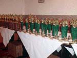 A photo of all the trophies lined up at one of the Bro Caders annual presentation evening. |